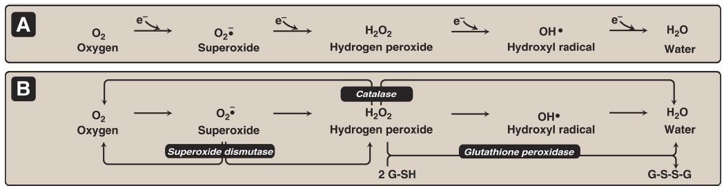 Hydrogen peroxide (H2O2) is one of a family of reactive oxygen species (ROS) that are formed from the partial reduction of molecular oxygen ([O2], Fig. 1A). These compounds are formed continuously as byproducts of aerobic metabolism, through reactions with drugs and environmental toxins, or when the level of antioxidants is diminished, all creating the condition of oxidative stress. These highly reactive oxygen intermediates can cause serious chemical damage to DNA, proteins, and unsaturated lipids and can lead to cell death. ROS have been implicated in a number of pathologic processes, including reperfusion injury, cancer, inflammatory disease, and aging. The cell has several protective mechanisms that minimize the toxic potential of these compounds. [Note: ROS can also be generated in the killing of microbes by white blood cells (WBC).]