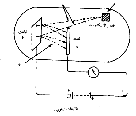 يقصد بالانبعاث الثانوي انبعاث الالكترونات من سطوح المعادن بعد قصفها بإلكترونات سريعة وبأجسام أخرى ذات طاقات عالية نسبيا. فعندما تصطدم الالكترونات ذات السرع العالية ، بسطوح المعادن فأنها تنقل بعض اوكل طاقتها الى الكترونات ذلك المعدن ولا يختلف الأمر هنا عما هو عليه في الظاهرة الكهروضوئية. فاذا كانت الطاقة المنقولة كافية ومساوية لدالة الشغل للمعدن او أكبر فان الالكترونات سوف تهرب من سطوح هذه المعادن. هذا النوع من انبعاث الالكترونات يدعى بالانبعاث الثانوي للإلكترونات ذلك لأنه كان يسبب القصف الالكتروني. تدعى الالكترونات القاصفة عادة بالإلكترونات الاولية اما الناتجة فتدعى بالإلكترونات الثانوية .