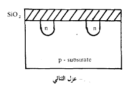 ويتم الحصول على هذه الطريقة في العزل عمليا عن طريق ربط طبقة الاساس P الى اكثرالجهود سالبية ( غالبا ماتكون الارض) في الدائرة وبذلك يتولد لدينا ثنائي وصلة PN منحازعكسيا ومن ثم لايسمح للتيار بالسريان من منطقة لا الى اخرى . انظرالشكل (1) .