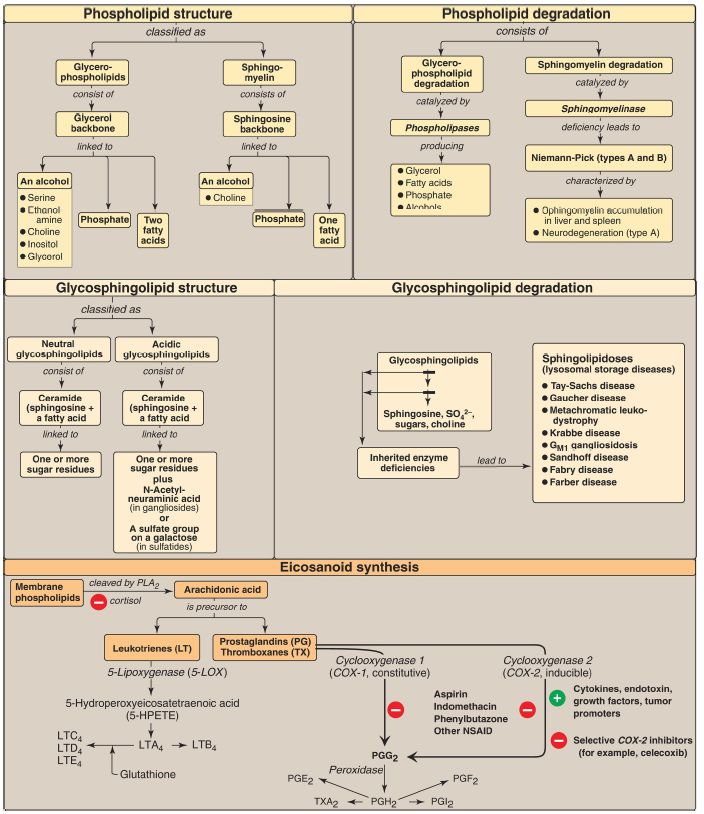Insufficient surfactant production causes respiratory distress syndrome. Phosphatidylinositol (PI) serves as a reservoir for arachidonic acid in membranes. The phosphorylation of membrane-bound PI produces phosphatidylinositol 4,5-bisphosphate (PIP2). This compound is degraded by phospholipase C in response to the binding of various neurotransmitters, hormones, and growth factors to membrane G protein–coupled receptors. The products of this degradation, inositol 1,4,5- trisphosphate (IP3) and DAG, mediate the mobilization of intracellular calcium and the activation of protein kinase C, which act synergistically to evoke cellular responses. Specific proteins can be covalently attached via a carbohydrate bridge to membrane-bound PI, forming a glycosyl phosphatidylinositol (GPI) anchor. A deficiency in GPI synthesis in hematopoietic cells results in the hemolytic disease paroxysmal nocturnal hemoglobinuria. The degradation of phosphoglycerides is performed by phospholipases found in all tissues and pancreatic juice. Sphingomyelin is degraded to a ceramide plus phosphorylcholine by the lysosomal enzyme sphingomyelinase, a deficiency of which causes Niemann-Pick (A and B) disease. Glycosphingolipids are derivatives of ceramides to which carbohydrates have been attached. Adding one sugar molecule to the ceramide produces a cerebroside, adding an oligosaccharide produces a globoside, and adding an acidic N-acetylneuraminic acid molecule produces a ganglioside. Glycosphingolipids are found predominantly in cell membranes of the brain and peripheral nervous tissue, with high concentrations in the myelin sheath. They are antigenic. Glycolipids are degraded in the lysosomes by acid hydrolases. A deficiency of any one of these enzymes causes a sphingolipidosis, in which a characteristic sphingolipid accumulates. Prostaglandins (PG), thromboxanes (TX), and leukotrienes (LT), the eicosanoids, are produced in very small amounts in almost all tissues, act locally, and have an extremely short half-life. They serve as mediators of the inflammatory response. Arachidonic acid is the immediate precursor of the predominant class of human PG (those with two double bonds). It is derived by the elongation and desaturation of the essential fatty acid linoleic acid and is stored in the membrane as a component of a phospholipid, generally PI. Arachidonic acid is released from the phospholipid by phospholipase A2 (inhibited by cortisol).