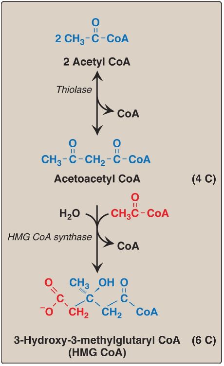 The first two reactions in the cholesterol biosynthetic pathway are similar to those in the pathway that produces ketone bodies . They result in the production of 3-hydroxy-3-methylglutaryl CoA ([HMG CoA], Fig. 1). First, two acetyl CoA molecules condense to form acetoacetyl CoA. Next, a third molecule of acetyl CoA is added by HMG CoA synthase, producing HMG CoA, a six-carbon compound. [Note: Liver parenchymal cells contain two isoenzymes of the synthase. The cytosolic enzyme participates in cholesterol synthesis, whereas the mitochondrial enzyme functions in the pathway for ketone body synthesis.]