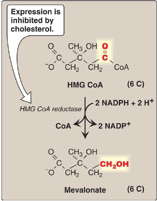 HMG CoA is reduced to mevalonate by HMG CoA reductase. This is the rate-limiting and key regulated step in cholesterol synthesis. It occurs in the cytosol, uses two molecules of NADPH as the reducing agent, and releases CoA, making the reaction irreversible (Fig. 2). [Note: HMG CoA reductase is an integral membrane protein of the SER, with its catalytic domain projecting into the cytosol.