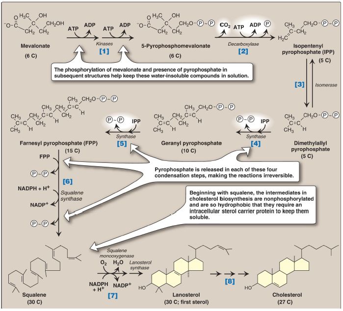 The reactions and enzymes involved in the synthesis of cholesterol from mevalonate are illustrated in Figure 3. [Note: The numbers shown in brackets below correspond to numbered reactions shown in this figure.]