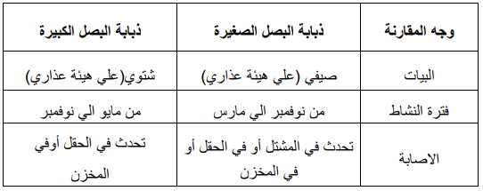 نظرا للتشابه الكبير بين كل من ذبابة البصل الصغيرة وذبابة البصل الكبيرة من حيث تاريخ الحياة وسلوك ومظهر الاصابة سوف نتناولهما معا وفي النهاية نذكر في جدول أهم الفروق بينهم.