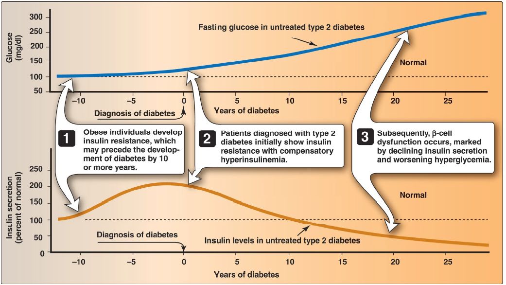 Figure 2: Progression of blood glucose and insulin levels in patients with type 2 diabetes.