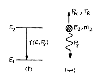 لنفترض الآن أن إشعاع γ قد انطلق بين الحالتين E2، E1 وذلك كما ينضح من الشكل (1. أ). أما آلية التفاعل فيوضحها الشكل (1. ب) حيث نجد أنه عندما تنطلق اشعة γ من المستوى E2 فإنم يرتد بزخم قدره PR (كما بالشكل) بينما تنطلق أشعة γ بزخم قدره γP . ويمكن الآن تطبيق قانوني حفظ الطاقة والزخم وينتج أن: