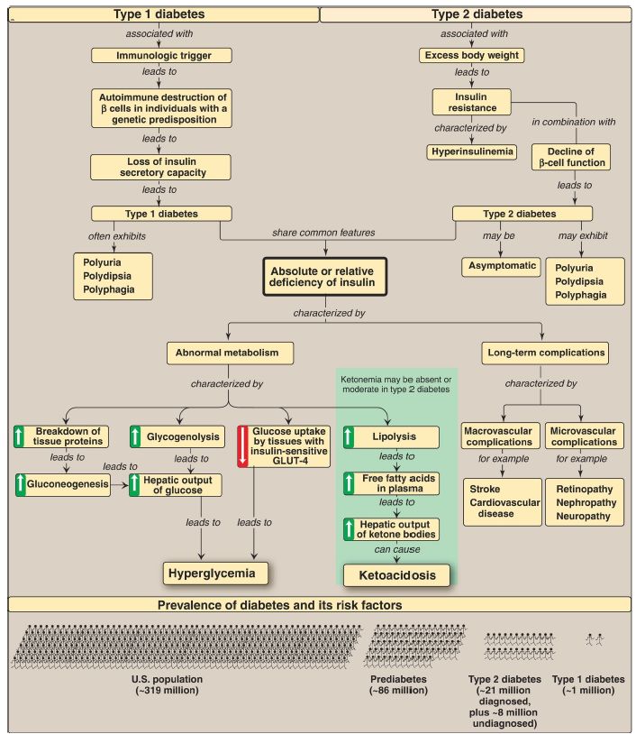 Diabetes mellitus is a heterogeneous group of syndromes characterized by an elevation of fasting blood glucose that is caused by a relative or absolute deficiency of insulin (Fig. 1). Diabetes is the leading cause of adult blindness and amputation and a major cause of renal failure, nerve damage, heart attacks, and stroke. Diabetes can be classified into two groups, type 1 (T1D) and type 2 (T2D). T1D constitutes ~10% of >29 million cases of diabetes in the United States. The disease is characterized by an absolute deficiency of insulin caused by an autoimmune attack on the pancreatic β cells. This destruction requires an environmental stimulus (such as a viral infection) and a genetic determinant that causes the β cell to be mistakenly identified as “nonself.” The metabolic abnormalities of T1D include hyperglycemia, diabetic ketoacidosis (DKA), and hypertriacylglycerolemia that result from a deficiency of insulin. Those with T1D must rely on exogenous insulin delivered subcutaneously to control hyperglycemia and ketoacidosis. T2D has a strong genetic component. It results from a