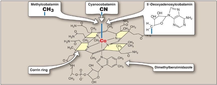 Cobalamin contains a corrin ring system that resembles the porphyrin ring of heme , but differs in that two of the pyrrole rings are linked directly rather than through a methene bridge. Cobalt is held in the center of the corrin ring by four coordination bonds with the nitrogens of the pyrrole groups. The remaining coordination bonds of the cobalt are with the nitrogen of 5,6-dimethylbenzimidazole and with cyanide in commercial preparations of the vitamin in the form of cyanocobalamin (Fig. 2). The physiologic coenzyme forms of cobalamin are 5′-deoxyadenosylcobalamin and methylcobalamin, in which cyanide is replaced with 5′-deoxyadenosine or a methyl group, respectively (see Fig. 2).