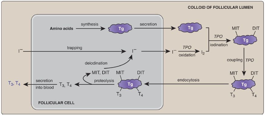 I is utilized in the synthesis of the thyroid hormones triiodothyronine (T3) and thyroxine (T4) that are required for development, growth, and metabolism. Circulating iodide (I−) is taken up (“trapped”) and concentrated in the epithelial follicular cells of the thyroid gland. It then is sent into the colloid of the follicular lumen where it is oxidized to iodine (I2) by thyroperoxidase (TPO), as shown in Figure 1. TPO then uses I2 to iodinate selected tyrosine residues in thyroglobulin (Tg), forming monoiodinated tyrosine (MIT) and diiodinated tyrosine (DIT), as shown in Figure 2. [Note: Tg is synthesized and secreted into colloid by follicular cells.] The coupling of two DIT on Tg gives T4, whereas coupling one MIT and one DIT gives T3. The iodinated Tg is endocytosed and stored in follicular cells until needed, at which time it is proteolytically digested to release T3 and T4, which are secreted into the circulation (see Fig. 1).