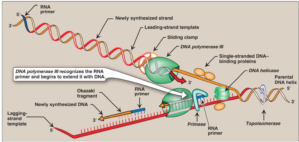 Figure 1: Elongation of the leading and lagging strands. [Note: The DNA sliding clamp is not shown for the lagging strand.]