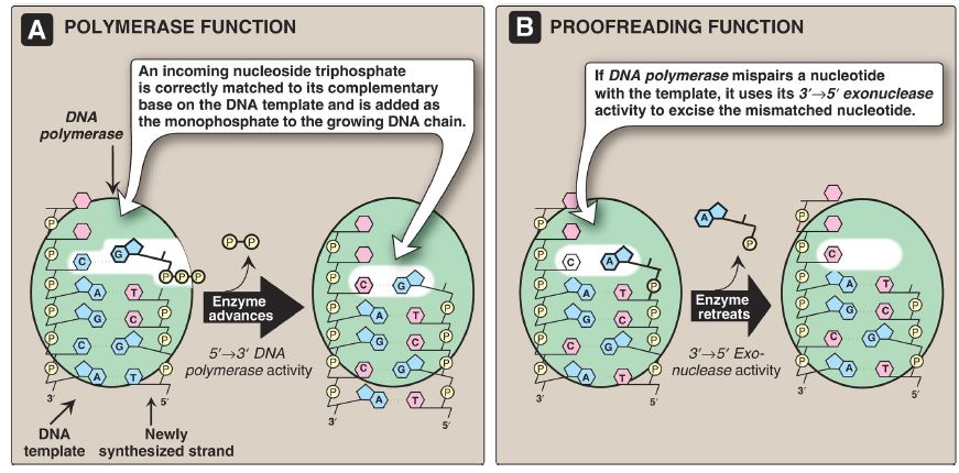 [Note: Because the enzyme requires an improperly base-paired 3′-hydroxy terminus, it does not degrade correctly paired nucleotide sequences.] For example, if the template base is C and the enzyme inserts an A instead of a G into the new chain, the 3′→5′ exonuclease activity hydrolytically removes the misplaced nucleotide. The 5′→3′ polymerase activity then replaces it with the correct nucleotide containing G (see Fig. 2). [Note: The 5′→3′ polymerase and 3′→5′ exonuclease domains are located on different subunits of DNA pol III.]