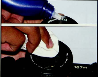- أو من خلال المنفاخ الذي يؤدي بالغرض ولا تستخدم فمك للنفخ ، لأن ذلك يؤدي إلى تجمع اللعاب على العدسة ولما يحتوي هـواء القسم من رطوبة عالية ، قد تؤدي إلى تلف أجزاء من الكاميرا كما بالشكل (126) .