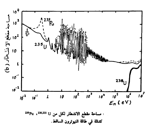 النيوترونات. حيث يتضح لنا أن احتمال الانشطار يتبع قانون v/1، وذلك عند الطاقات المنخفضة. كما توجد قمم رنينية لكل من pu 239 ،235U في مدى الطاقات من10 - 103 الكترون فولت تقريباً . أما في حالة U238 فإنه لا ينشطر إلا عندما تبلغ طاقة النيوترون حوالي مليون الكترون فولت.
