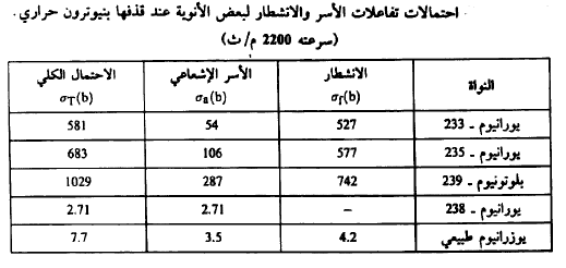 الجدول (1) احتمالات تفاعلات الأسر والانشطار لبعض الأنوية عند قذفها بنيوترون حراري.