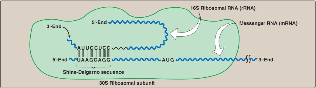 1. Shine-Dalgarno sequence: In Escherichia coli (E. coli), a purine-rich sequence of nucleotide bases, known as the Shine-Dalgarno (SD) sequence, is located six to ten bases upstream of the initiating AUG codon on the mRNA molecule (that is, near its 5′-end). The 16S rRNA component of the small (30S) ribosomal subunit has a nucleotide sequence near its 3′-end that is complementary to all or part of the SD sequence. Therefore, the 5′-end of the mRNA and the 3′-end of the 16S rRNA can form complementary base pairs, facilitating the positioning of the 30S subunit on the mRNA in close proximity to the initiating AUG codon (Fig. 1).