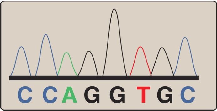 Because it contains no 3′-hydroxyl group, incorporation of a ddNMP terminates elongation at that point. The products of this reaction, then, consist of a mixture of DNA strands of different lengths, each terminating at a specific base. Separation of the various DNA products by size in an electric field using polyacrylamide gel electrophoresis, followed by autoradiography, yields a pattern of bands from which the DNA base sequence can be read. [Note: The shorter the fragment, the farther it travels on the gel, with the shortest fragment representing that which was made first (that is, the 5′-end).] In place of a labeled primer, a mixture of the four ddNTP linked to different fluorescent dyes and in a single reaction tube is now commonly used. The mixture is separated by capillary electrophoresis, the fluorescent labels are detected, and a color readout of the sequence is generated (Fig. 2). [Note: The Human Genome Project used variations of this technique to sequence the human genome.] Advances in sequencing technology, so-called next generation, or high-throughput sequencing, now allow the rapid sequencing of an entire genome with increased fidelity and decreased cost through the simultaneous (parallel) sequencing of many DNA pieces. [Note: Sequencing of the exome, that portion of the genome that encodes proteins, is now possible.]