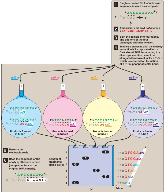 The base sequence of DNA fragments that have been cloned can be determined. The original procedure for this purpose was the Sanger dideoxy chain termination method illustrated in Figure 1. In this method, the single-stranded DNA (ssDNA) to be sequenced is used as the template for DNA synthesis by DNA polymerase (DNA pol). A radiolabeled primer complementary to the 3′-end of the target DNA is added, along with the four deoxyribonucleoside triphosphates (dNTP). The sample is divided into four reaction tubes, and a small amount of one of the four dideoxyribonucleoside triphosphates (ddNTP) is added to each tube.