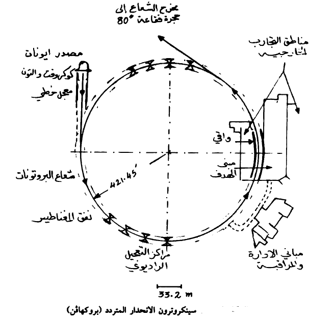 إن أقوى المعجلات العروفة الآن تعمل وفق المبدأ السابق سواء لتعجيل البروتونات أو الإلكترونات. إن أول معجل بني عام 1959 في سيرن لتعجيل بروتونات طاقتها 50 م.أ. ف. إلى 28 ج. أ. ف. كما بنى آخر عام 1960 في بروكهافن لتعجيل البروتونات إلى 30 ج. أ. ف. نبين هذا العمل في الشكل (3). حيث يتم تعجيل البروتونات مبدئياً إلى طاقة تساوي 50 م. أ. ف باستخدام كل من معجل كوكروفت والتون ومعجل خطي (LINAC) عدد أنابيب التدفق به 124 أنبوبة. ثم تحقن هذه إلى سينكروترون الانحدار المتردد المبين بالشكل. بلغ اتساع أنبوب التفريغ هنا 7 بوصات وارتفاعه 2.75 بوصة (قارن هذه الأبعاد مع أبعاد الكوزموترون حيث بلغ الاتساع 36 بوصة والارتفاع 7 بوصات). وبلغ التفريغ هنا mmHg 5-10 بينما ضم المغناطيس 240 وحدة زنة كلمنها 60 طناً.