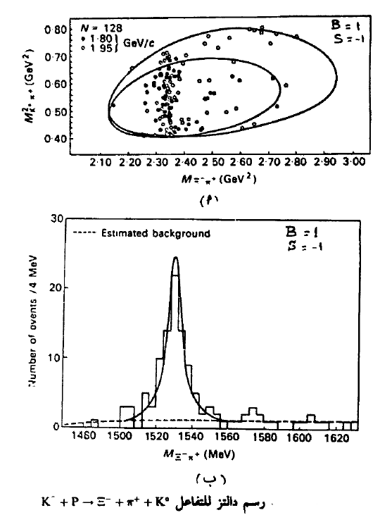 يبين الشكل (4) التفاعل (3) حيث نجد في الشكل (4 .أ) رسم دالتز للتفاعل بينما يوضح الشكل (4 .ب) مخطط توزيع التواتر Histogram لكتلة الجسيم (-π+ Ξ) الذي يعرف الآن بالجسيم الرنيني (*Ξ). يبين الشكل أن كتلة هذا الجسيم تساوي (1.530) ج. أ.ف. ويتحلل حسب العلاقة: