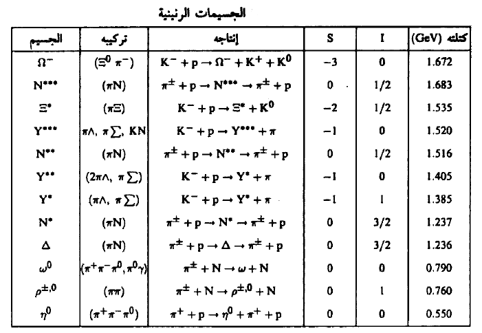 نبين في الجدول (1) أهم الجسيمات الرنينية المكتشفة.