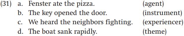 The second part of the answer to our question has to do with under-standing the argument structures of verbs. You’ll recall that the argument structure of a verb consists of those arguments that are semantically necessary to the verb. What is most interesting for our purposes is that in English there is a range of semantic roles that the subject of a verb can play: