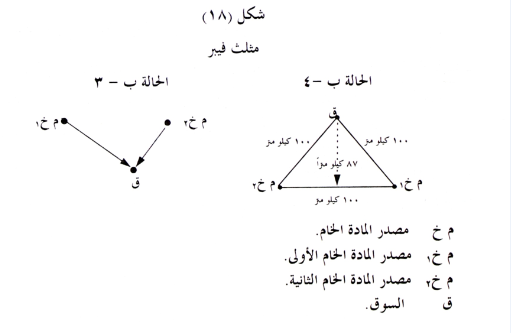 ٤ - إذا كان كلا المادتين الخام محدداً وغير نقي، فالحل حينئذ يصبح معقداً، ولا بد لحل هذه المشكلة من استخدام مثلث فيبر لتحديد الموقع، حيث تحتل السوق إحدى زواياه ق ومصدر خ١ (م خ١) الزاوية الثانية، ومصدر خ٢ (م خ٢) الزاوية الثالثة، كما هو واضح في الشكل السابق .