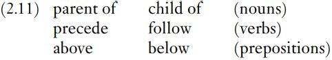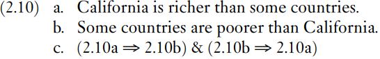 The entailment pattern illustrated in (2.10) defines converseness. Firstly, note that (2.10c) represents a two-way entailment, from (2.10a) to (2.10b) and also back from (2.10b) to (2.10a). This makes (2.10a) and (2.10b) paraphrases of each other. In this respect, it is a similar relationship to synonymy, but there is an important additional difference between (2.10a) and (2.10b). Not only has richer been replaced by poorer in going from (2.10a) to (2.10b), but the noun phrases California and some countries have been exchanged. Converses are thus a species of synonym that requires reordering of noun phrases. (The change from is to are is a detail of English grammar that is not semantically relevant here.)