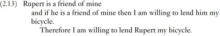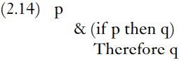 The inference at the end of (2.13) – after the word Therefore – depends entirely on the structure of that three-line discourse. The reasoning is valid simply because it fits a particular pattern that always yields true conclusions if the premises (initial statements) are true. The pattern is set out in (2.14).