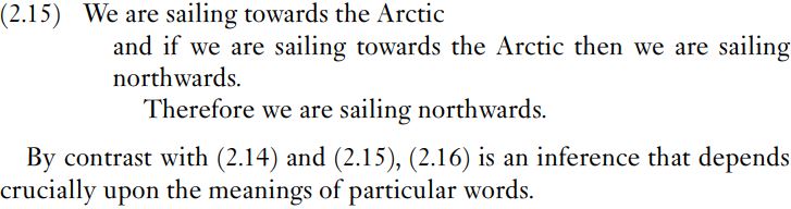 By contrast with (2.14) and (2.15), (2.16) is an inference that depends crucially upon the meanings of particular words.