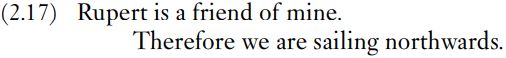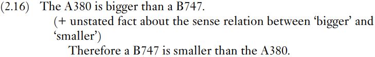 Leaving out the material in brackets gives an argument which is accepted as valid by people who know English: The A380 is bigger than a B747, therefore a B747 is smaller than the A380 (even if they do not realize that the reference here is to two kinds of aircraft). However, it is an argument that does not follow from the structure of the discourse. The discourse has the structure ‘p therefore q’ and that is certainly not a generally valid line of reasoning. If the formula ‘p therefore q’ was generally valid, then it should yield satisfactory arguments no matter what we substitute for p and q, but in fact this pattern can yield nonsense, as suggested by (2.17).