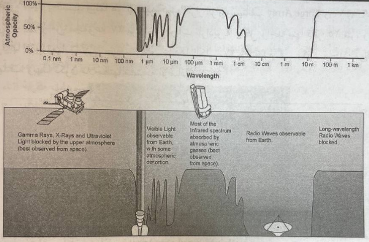 لتلسكوبات الفضاء ميزات، فهي لا تخضع لتأثيرات الغلاف الجوي للأرض، والتي تؤدي إلى عدم وضوح الصورة. بالإضافة إلى ذلك هنالك العديد من الموجات الكهرومغناطيسية التي لاتصل إلى الأرض ولأنه يتم امتصاصها أو انعكاسها من قبل الغلاف الجوي للأرض. في الواقع وكما ترون من الرسم البياني أدناه، ما هي إلا موجات الضوء المرئي، لجزء من الأشعة تحت الحمراء، وجزء من موجات الراديو التي تصل إلى الأرض على الإطلاق. لرصد الأشعة فوق البنفسجية، الأشعة السينية، أشعة كاما أو الأشعة تحت الحمراء، يقوم علماء الفلك بوضع تلسكوبات خارج الغلاف الجوي للأرض، وعادة في مدار حول الأرض.