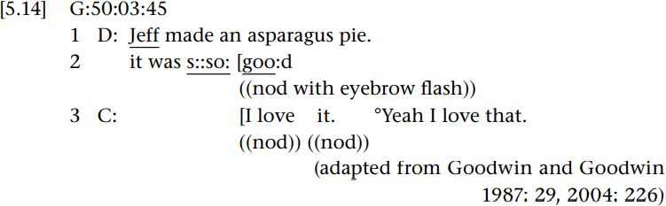 Dianne and Claica manage to accomplish simultaneously a positive assessment of Jeff’s pie, namely, that they both think it was delicious. In order for Claica to chime in at the right time she must have been able to anticipate what Dianne was meaning here. One resource Claica likely drew from here, alongside the non-verbal cues, is the emerging syntax, where the intensifier “s::so:” occurs in a construction through which Dianne is obviously about to attribute something to the pie (by means of the referring expression “it”). The occurrence of an intensifier in an attribution syntactic construction primes an understanding of Dianne’s utterance not only as an assessment (what Dianne does with her utterance), but also that this assessment is going to be a positive one (what Dianne means by her utterance).