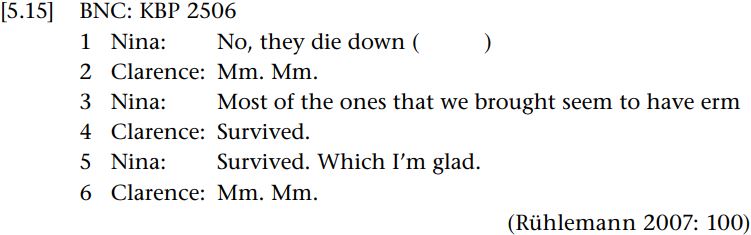 Here, in response to Nina indicating through the hesitation token erm that she is struggling to find the right word (line 3), Clarence completes the clause begun by Nina in the next turn (line 4). Nina then further expands upon the previously co-constructed utterance with the addition of which I’m glad (line 5). In this way, these two speakers can be seen to be co-constructing a single, complex syntactic unit through both completion and expansion of the prior speaker’s utterance.