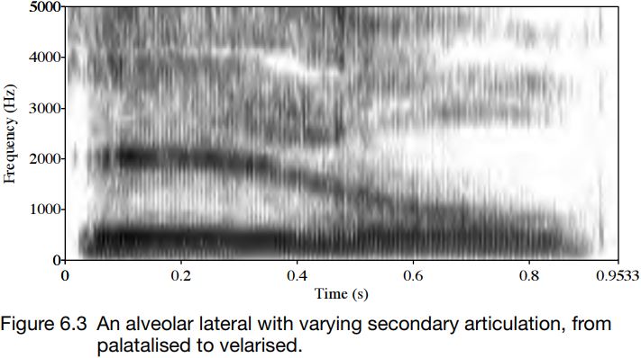 The articulatory variability is reflected acoustically. Figure 6.3 shows the effect of secondary articulations on the acoustics of laterals. This is a spectrogram of a production of [l] whose secondary articulation is shifted from palatalized to velarized. Notice that F2 – associated with frontness and backness – changes, moving from rather high, at around 2100 Hz, to low, at under 1000 Hz.