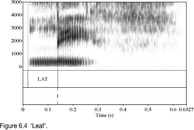 Figure 6.4 shows a spectrogram of an utterance of the word ‘leaf ’. The lateral portion is marked LAT. At the very end of it, at the point marked 1, there is a spike; this corresponds to the release of the tongue tip from the alveolar ridge and the switch from central to lateral airflow. This change in airflow has an acoustic effect too: notice that the lateral portion is lighter in colour (which means that it is lower in amplitude)