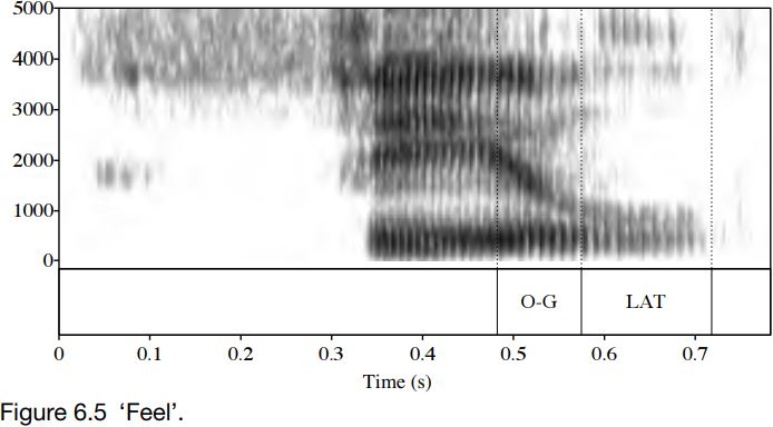 Figure 6.5 is a spectrogram of an utterance of the word ‘feel’. The portion marked O-G (on-glide) shows the formants moving from the values for the vocalic portion – note in particular the high F2 associated with a close front spread vowel – to the values for a velarized lateral. This implies a low F2; and in the portion marked LAT, it can be seen that F2 is at around 1000 Hz. This utterance is by the same speaker as the previous example, so the lateral here is darker than the lateral in ‘leaf ’. The on-glide, it can be noticed, is almost as long as the period of only lateral airflow. Notice that as with ‘leaf ’, lateral airflow induces lower amplitude, seen in the overall lighter spectrogram for the LAT portion.