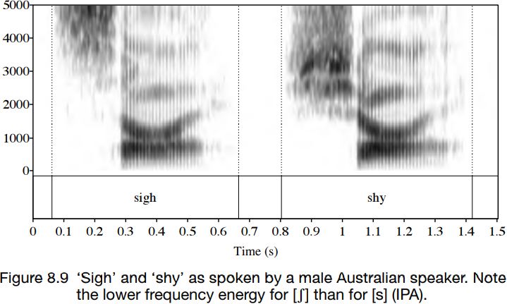 Figure 8.9 shows a spectrogram of an Australian male speaker saying the words ‘sigh’ and ‘shy’. Note that the centre of the energy in the fricative portion is lower for [ʃ] than for [s], having significant energy at 2000 Hz and above. Lip-rounding for [ʃ] can be thought of as enhancing one of the acoustic differences between [s] and [ʃ].
