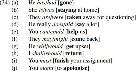 Having looked at the nominal functional category pronoun, we now turn to look at the verbal functional category auxiliary. Traditional grammarians use this term to denote a special class of items which once functioned simply as verbs, but in the course of the evolution of the English language have become sufficiently distinct from main verbs that they are now regarded as belonging to a different category of auxiliary (conventionally abbreviated to AUX).