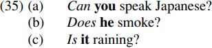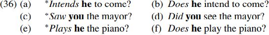 There are clear syntactic differences between auxiliaries and verbs. For example (as we saw in §1.5), auxiliaries can undergo inversion (and thereby be moved into pre-subject position) in questions such as (35) below, where the inverted auxiliary is italicized and the subject is bold-printed:
