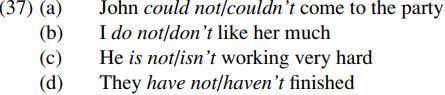 A second difference between auxiliaries and verbs is that auxiliaries can generally be directly negated by a following not (which can usually attach to the auxiliary in the guise of its contracted form n’t):
