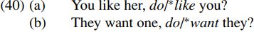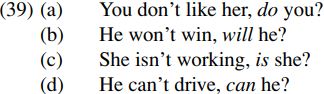(Note that in structures such as John decided not to stay the negative particle not negates the infinitive complement to stay rather than the verb decided, as we see from the fact that the sentence can be paraphrased as ‘John decided that he would not stay’, not as ‘John did not decide that he would stay.’) And thirdly, auxiliaries can appear in sentence-final tags, as illustrated by the examples below (where the part of the sentence following the comma is traditionally referred to as a tag):