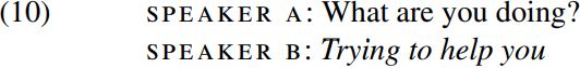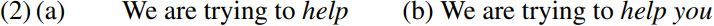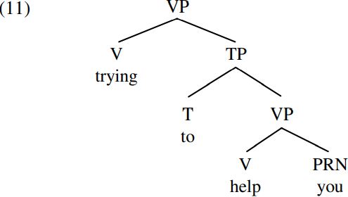 The resulting phrase trying to help you is headed by the verb trying, as we see from the fact that it can be used after words like be, start or keep which select a complement headed by a verb in the -ing form (cf. They were/started/kept trying to help you). This being so, the italicized phrase produced by speaker B in (10) is a VP (= verb phrase) which has the structure (11) below: