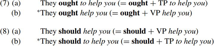 If we assume that help you is a VP whereas to help you is a TP, we can account for the contrasts in (7) and (8) by saying that ought is the kind of word which selects (i.e. ‘takes’) an infinitival TP as its complement, whereas should is the kind of word which selects an infinitival VP as its complement. Implicit in this claim is the assumption that different words like ought and should have different selectional properties which determine the range of complements they permit (as we saw in §2.11).