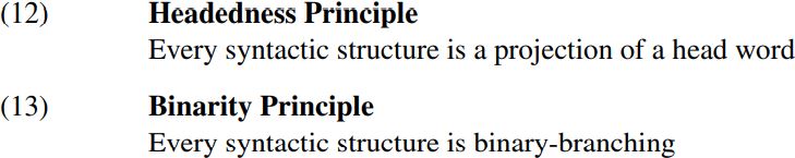 Since our goal in developing a theory of Universal Grammar/UG is to attempt to establish universal principles governing the nature of linguistic structure, an important question to ask is whether there are any general principles of constituent structure which we can abstract from structures like (5), (9) and (11). If we look closely at the relevant structures, we can see that they obey the following two (putatively universal) constituent structure principles: