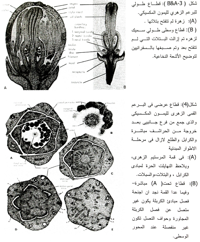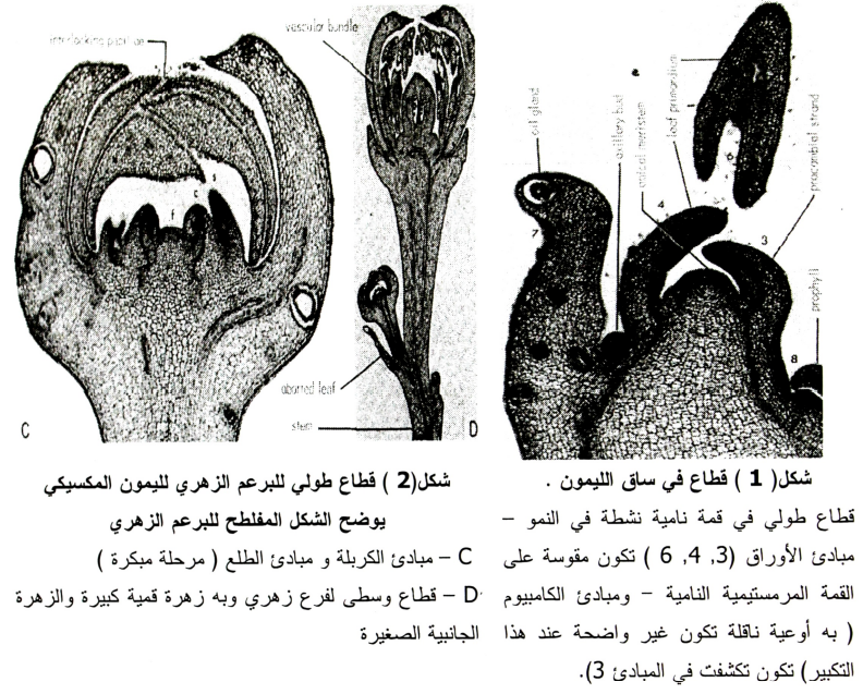 وتحدد الحالة التشريحية للقمة تتابع Sequence ومصير Disposition البراعم الجانبية (1987 ,Lord and Echard). فإذا كونت القمة النامية سبلات فإن البراعم الجانبية ستكون أزهار أيضا وعلى العكس إذا كونت القمة أوراق فإن البراعم الجانبية ستكون أزهار أيضا، وعلى العكس إذا كونت القمة أوراق فإن البراعم الجانبية ستكون أشواك. ولا يعتمد معدل تكوين الزهرة من توقيت خروج البرعم إلى الأزهار على موقع الزهرة أو نوع النورة ولكن يكون مرتبطا ارتباطا موجبا بعدد الوحدات الحرارية (1984 ,Lovatt et al). ويمكن توصيف المراحل المختلفة لنشأة وتطور الأجزاء الزهرية في الموالح فيما يلي: