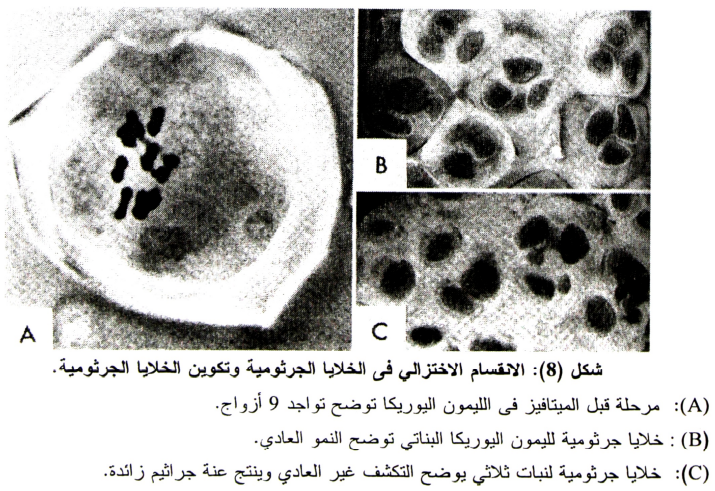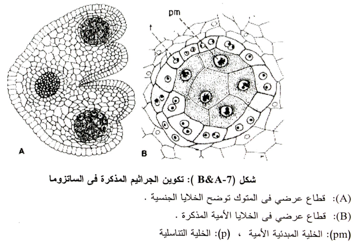 والخلية الأمية لحبوب اللقاح قبل الانقسام الاختزالي الأول تكون متميزة عن خلايا النسيج المغذي Tapetum والمتواجدة حولها حيث تكون ذات حجم كبير وتحتوي على نواة واحدة وذات صبغة مختلفة (شكل 7-B) وفي المرحلة المتأخرة من ال Prophase من الانقسام الأول فإن الخلية الأمية تستدير وتبقى جدران الخلية الأساسية الجرثومية الأمية في صورتها الأساسية إلى أن تنكسر في نهاية مرحلة ال Sporad والتي يكون فيها السيتوبلازم جدار جديد مستدير داخل الجدار الرئيسي بمسافة (شكل 8-A).