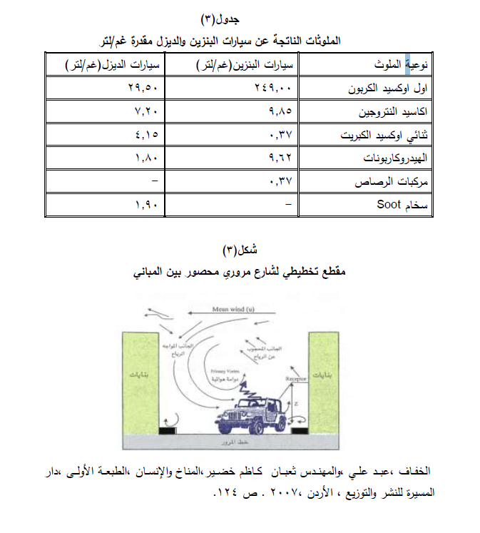 من أهم مصادر تلوث البيئة عامة وتلوث هوائها بشكل خاص. إذ تسهم في أنتشار ملوثات الهواء في عدد من المناطق جدول (۳) وتسبب تلك الوسائط من خلال ماتنفثه من ملوثات التي تدخل الى العديد من الطرق الرئيسة والشوارع الفرعية وتصل ملوثاتها إلى المنازل أيضا وخاصة تلك التي تقع بالقرب من الشوارع الداخلية للمدن والطرق شكل (3) ، وتشير الدراسات إلى أن وسائط النقل أصبحت المصدر الرئيسي للتلوث في الولايات المتحدة الأمريكية واليابان ووصلت نسبة التلوث خلال القرن الحادي والعشرين إلى ( %۹۰) من مجموع الملوثات في العالم. فإن تزايد عدد السيارات يعني زيادة في كمية الغازات المنبعثة من عوادم هذه السيارات. وتحدد كمية الغازات الصادرة من قطاع النقل بحسب نوع الآليات وحجم المحركات ونوعية الوقود المستعملة. وتعد وسائل النقل وخاصة السيارات المصدر الرئيس التلوث الهواء في المدينة.
