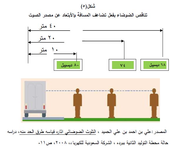 ج- المسافة (Distance): تؤثر بعد أو قرب مصدر الضوضاء على المتلقي ، فعلى الرغم من وجود فروق معنوية بين تأثير مستوياتها، فقد أظهرت تخفيضا تدريجيا بزيادة البعد عن المصدر ويعود السبب إلى تشتيت موجات الصوت كلما زادت المسافة خاصة في الفضاءات المفتوحة مما يقلل الضرر المتوقع حدوثة. وتعني المسافة (الحد الفاصل بين مصدر الضوضاء والمستلم للضوضاء) أي كلما قلت المسافة بين المستلم ومصدر الضوضاء أزداد معدل الضوضاء شكل (2) فضلا عن زيادة الضرر المترتب عليها والعكس صحيح.