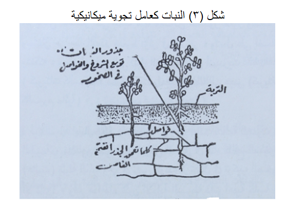 فعل الكائنات الحية: وهي عامل طبيعي يضاف الى عوامل التجوية الميكانيكية. فجذور الاشجار تستطيع التداخل والتعمق في الصخور التي تكتنفها الفواصل والشروخ ومثلها الصخور الطباشيرية (شكل 3) وقد تساعد الحيوانات في نبش الحطام الصخري الذي تعرض جزئيا من قبل لتأثير التجوية. ولعل فعل الارانب أوضح مثال لذلك.