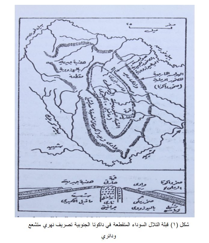 وتتسبب التراكيب القبابية أحيانا في نشأة نظام آخر من التصريف المائي – عدا التصريف المتشعع – يعرف بالتصريف الدائري Annular حول قاعدة القبة، ويبدو ذلك جليا في منطقة التلال السوداء في ولايتي داكوتا الشمالية وواومنج. وقد كانت التلال أصلا أشبه بقبة مستطيلة الشكل تتوسطها كلتة جرانيتية متداخلة تحف بها صخور متحولة من الشسمت، وكانت تغطيها طبقات الصخور الجيرية والرملية. وقد عمل نهر شيين Cheyemme وروافده (تصريف متشعع) على نحت القبة وتقطيعها، وتمكن من الكشف عن كتلتها اللورية الوسطى، وبقيت مخلفات الغطاء الرسوبي القديم المتآكل على جوانبها مكونة لهضيبات تكتنفها الحافات الشديدة الانحدار. وتجرى الانهار في مجاري دائرية حومل القبة متوافقة مع مضارب تلك التكوينات الضعيفة ومشكلة لما يعرف بالتصريف النهر الدائري (شكل 1).
